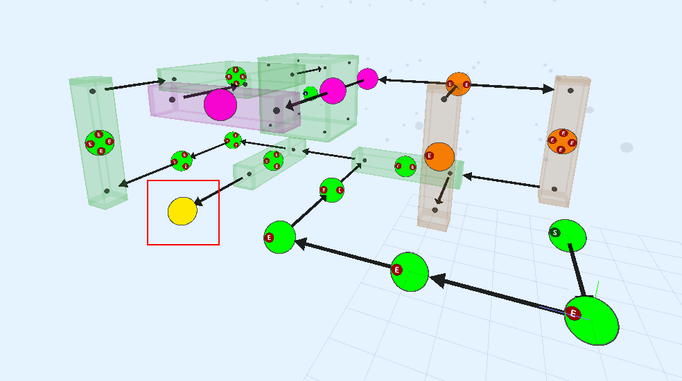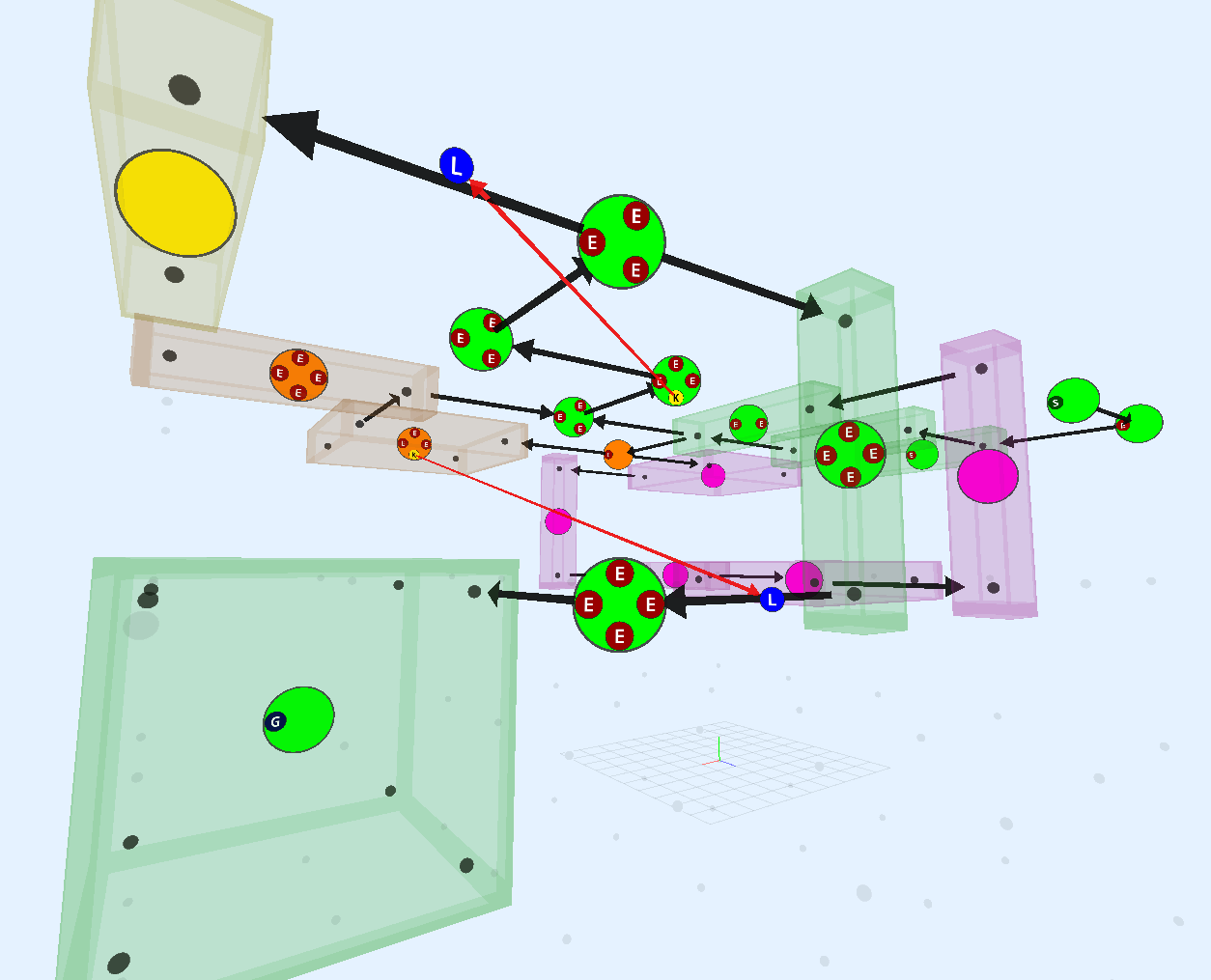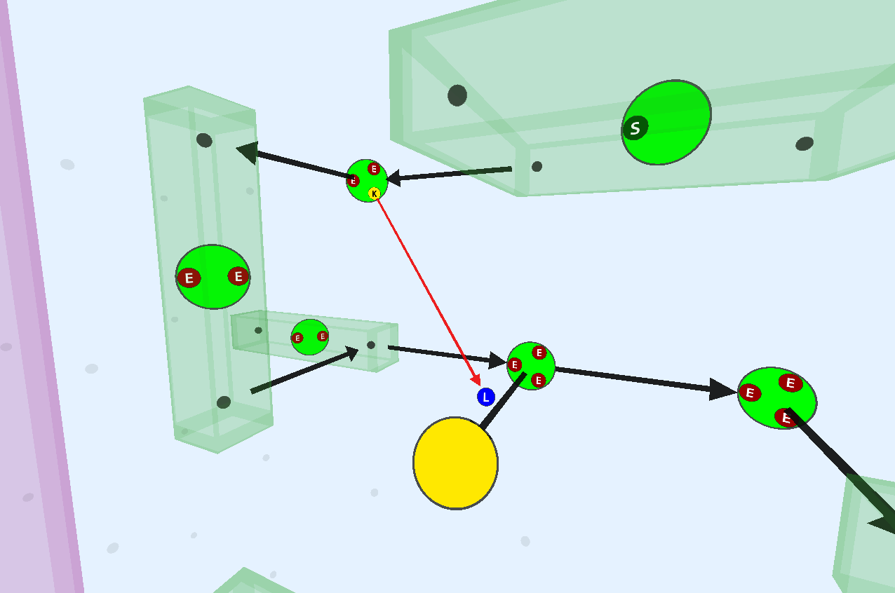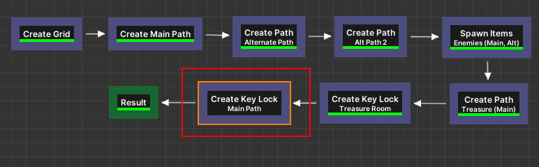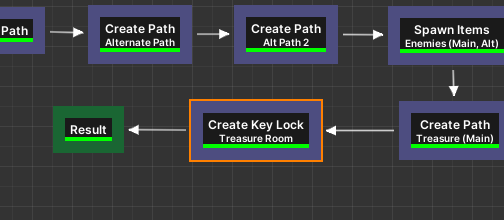 A blue lock item was created on the link that connects to the yellow treasure node. The key was placed somewhere in the main path (green). The red arrow shows the key-lock relationship