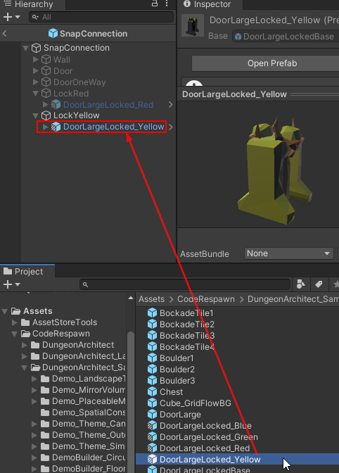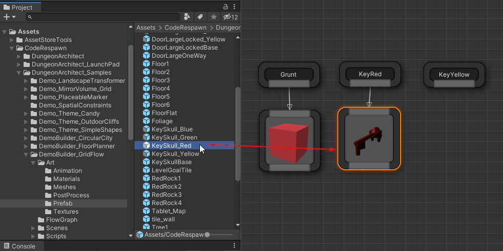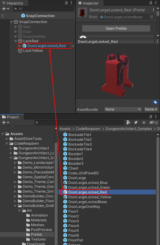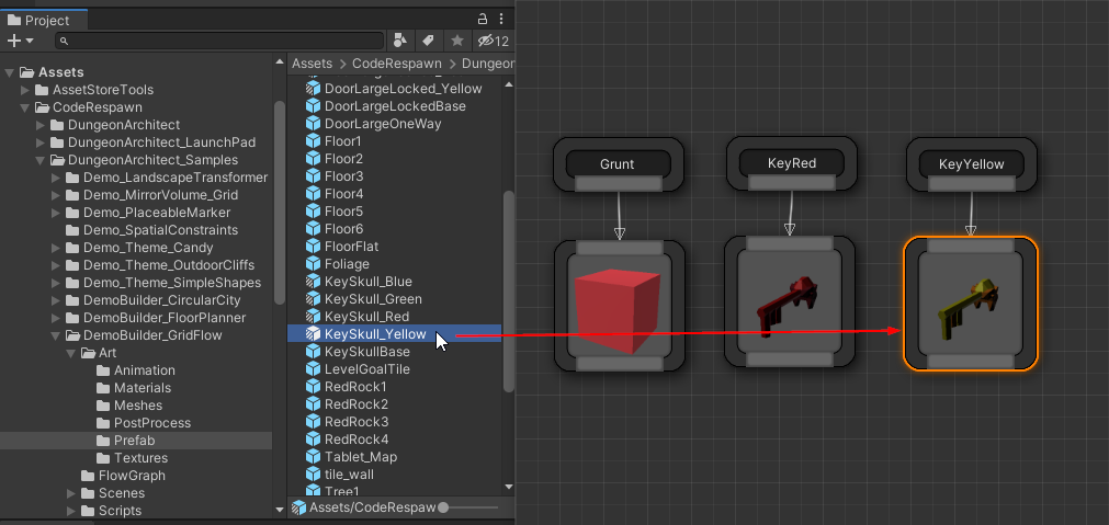 prefabs other than the visuals and they are both variants of the same parent prefab. The flow system will automatically supply it with the valid key ids when the dungeon is built and a common logic is used to check if we can open the door. More on this later