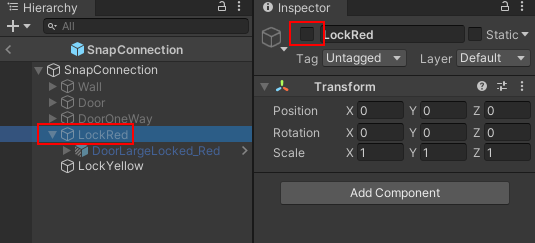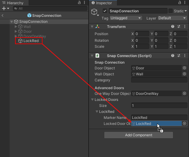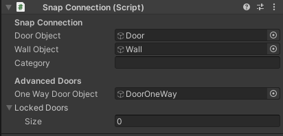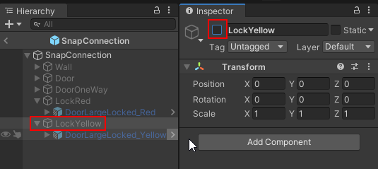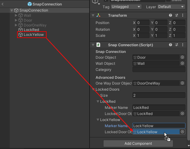 - We'll use the Snap Connection prefab to spawn the locked door prefab. Set the marker name to anything you like, however you'll need to create a corresponding mapping in the snap connection to spawn the locked door prefab. For this tutorial, set this toLockYellow